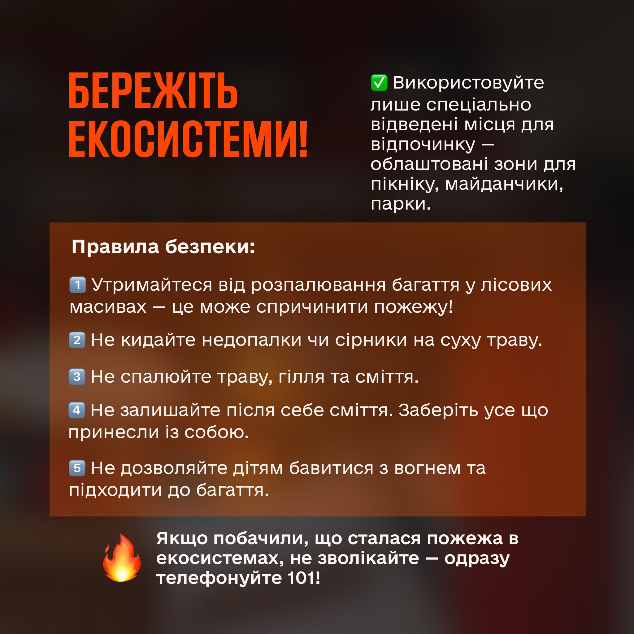 Крім цього у випадку відвідування природних екосистем утримайтесь від розпалювання багаття у лісових масивах, поблизу сухої рослинності (очерет, кущі і таке інше), не дозволяйте дітям бавитися з вогнем та підходити до багаття. Використовуйте лише спеціально відведені місця для відпочинку.