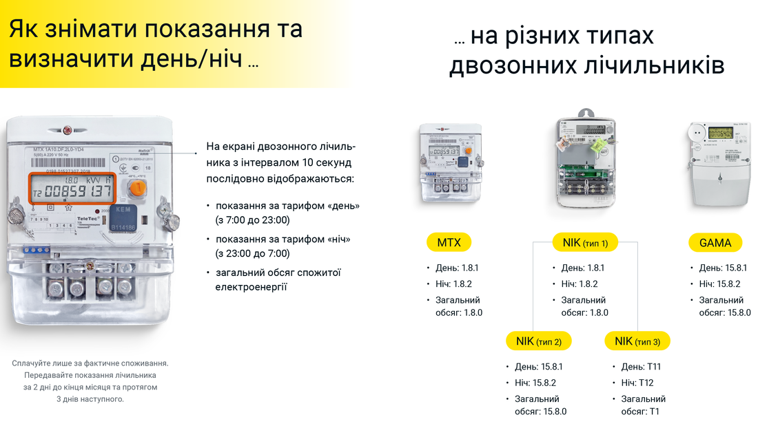 У випадку, якщо у клієнта встановлений двозонний лічильник, чат-бот йому запропонує почергово передати покази в зоні «день» та «ніч». В залежності від типу приладу обліку вони можуть бути позначені на табло різними індексами. «День» – 1.8.1, 15.8.1 або Т11. «Ніч» – 1.8.2, 15.8.2 або Т12.